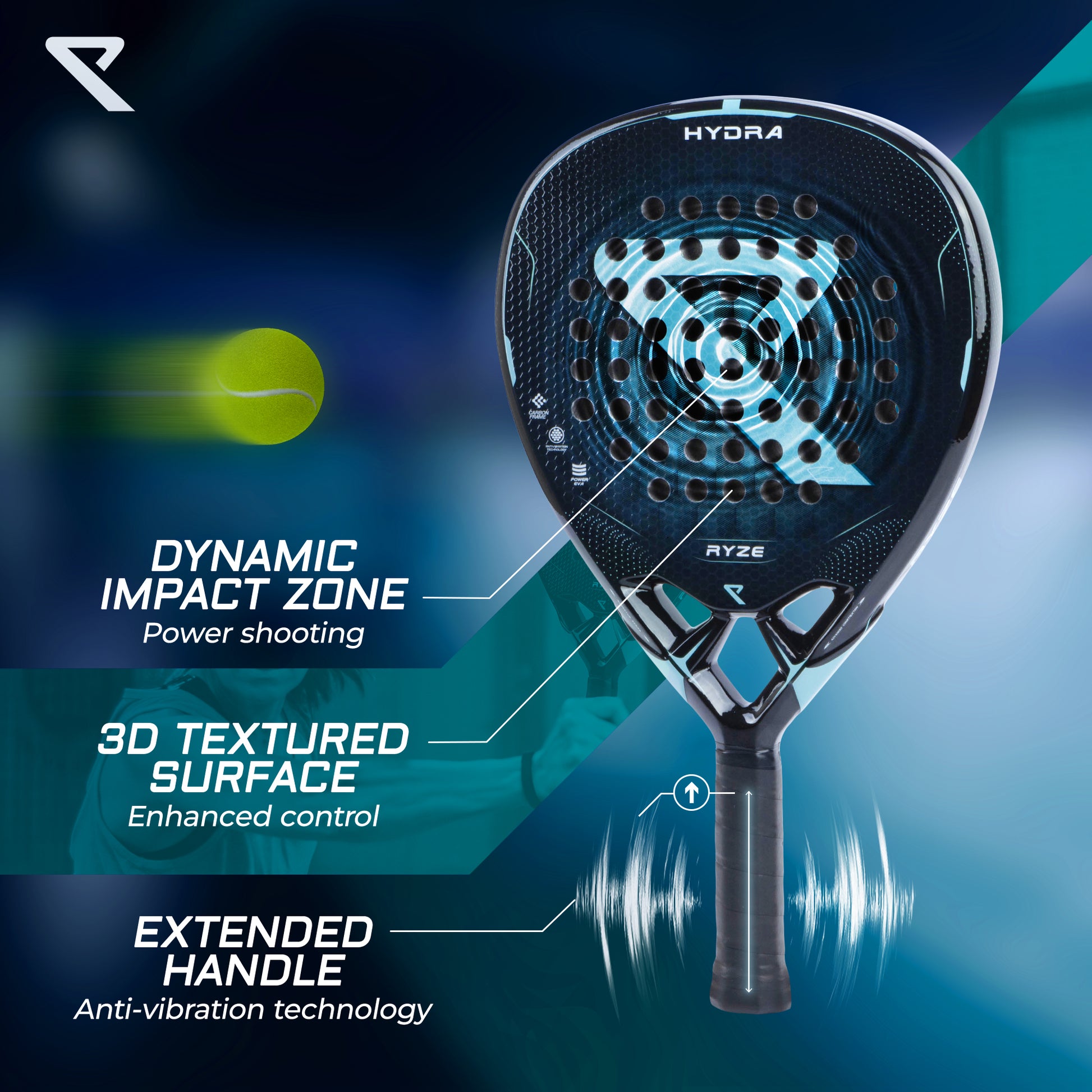 RYZE HYDRA er det perfekte hybrid power-bat, ideelt til øvede og avancerede spillere. Det leverer kraftfulde og præcise slag med sin EVA-18 power foam-kerne og 3D-teksturerede overflade. 1K kulfiberkonstruktionen giver en stærk og responsiv fornemmelse uden ekstra vægt.